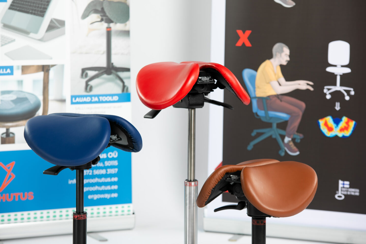 Sellise istumisasendi kogu tööpäevaks tagavad sadultoolid, meie tootevalikus näiteks Salli Swing ja Salli SwingFit sadultoolid. Sadultoolide liikumismehhanism võimaldab istmel liikuda igas suunas. Sadultool järgib istuja liikumist, mitte vastupidi. Sadultoolil istudes jaotub keharaskus istmikuluude, jalgade ja küünarnukkide vahel ega rõhu pehmeid kudesid. Sadultool aktiveerib ilma lisapingutuseta süvalihaseid, kõhulihaseid ja vaagnapõhjalihaseid ega suru kinni vereringet. Jalad on 90-kraadise nurga all lahus, mis võimaldab vaagnal olla oma loomupärases asendis ja hoida selgroogu loomulikus asendis.